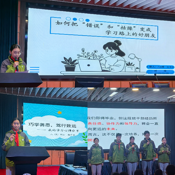 本次大会特别邀请到九(1)班的学长学姐们到场助阵。他们深情分享了自己班级从青涩稚嫩到沉稳成熟、从依赖引导到自主奋进的成长故事,围绕责任担当、团队协作、创新实践等话题展开的讲述,生动展现了一个优秀班集体在凝聚中成长、在互助中共进的向上力量,为八年级各班的建设与发展提供了宝贵的参考经验。
