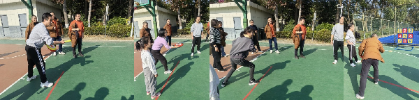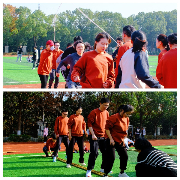 压轴项目“同心击节,齐足并跃”跳竹竿更是精彩纷呈,四名队员在黄敏老师“开合开合开开合合”的竹竿节奏口号中轻盈跃动,老师们明快节奏,步调一致,动作流畅,展现了非凡的团队凝聚力,成为赛场上一道亮丽的风景线。