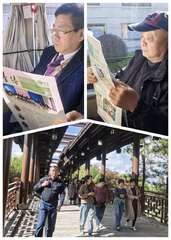 深秋的梅花洲,丹桂余香,秋色如画。退休教师们在车上翻阅着《毓秀行知》、《墨缘》两份校报了解学校的近况。经过一个小时的车程便来到了风景区,老教师们在学校领导和学生的悉心陪伴下,漫步于青石板路,流连于白墙黛瓦、小桥流水之间。他们精神矍铄,谈笑风生,时而驻足欣赏千年银杏的璀璨金黄,时而聆听石佛古寺的晨钟暮鼓,感受着这片江南水乡古镇的静谧与禅意。学生们围绕在侧,认真倾听老教师们讲述过往的教学故事与人生阅历,仿佛穿越时空,触摸到学校发展的历史脉络。一老一少,身影相伴,构成了一幅尊师重道、薪火相传的动人画卷。