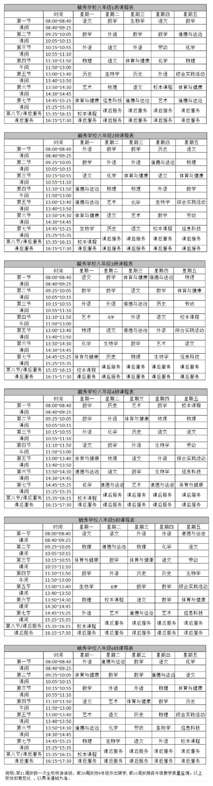 上海市毓秀学校2025学年第一学期八年级课程表